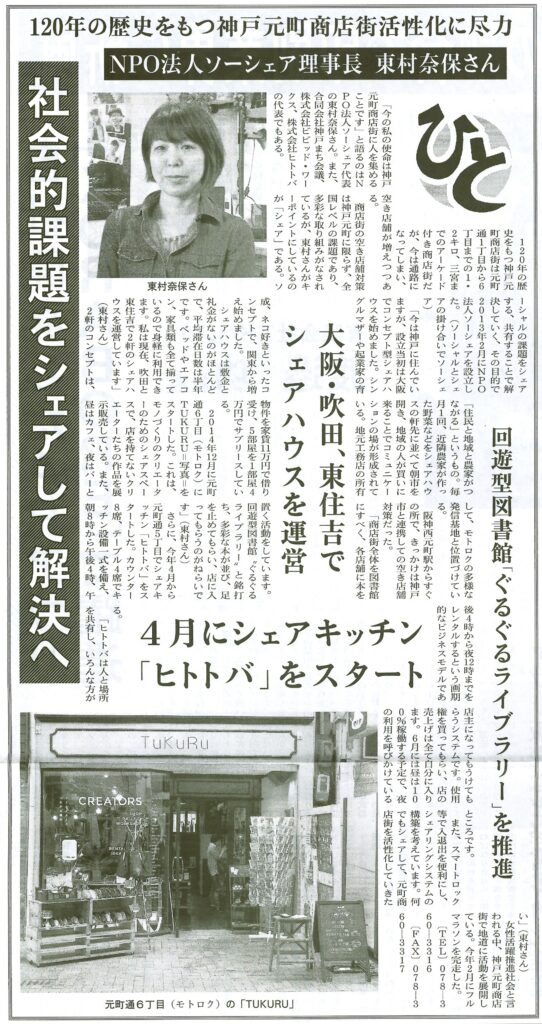 ”ひと”に NPO法人ソーシェア理事長 東村奈保が掲載されました。